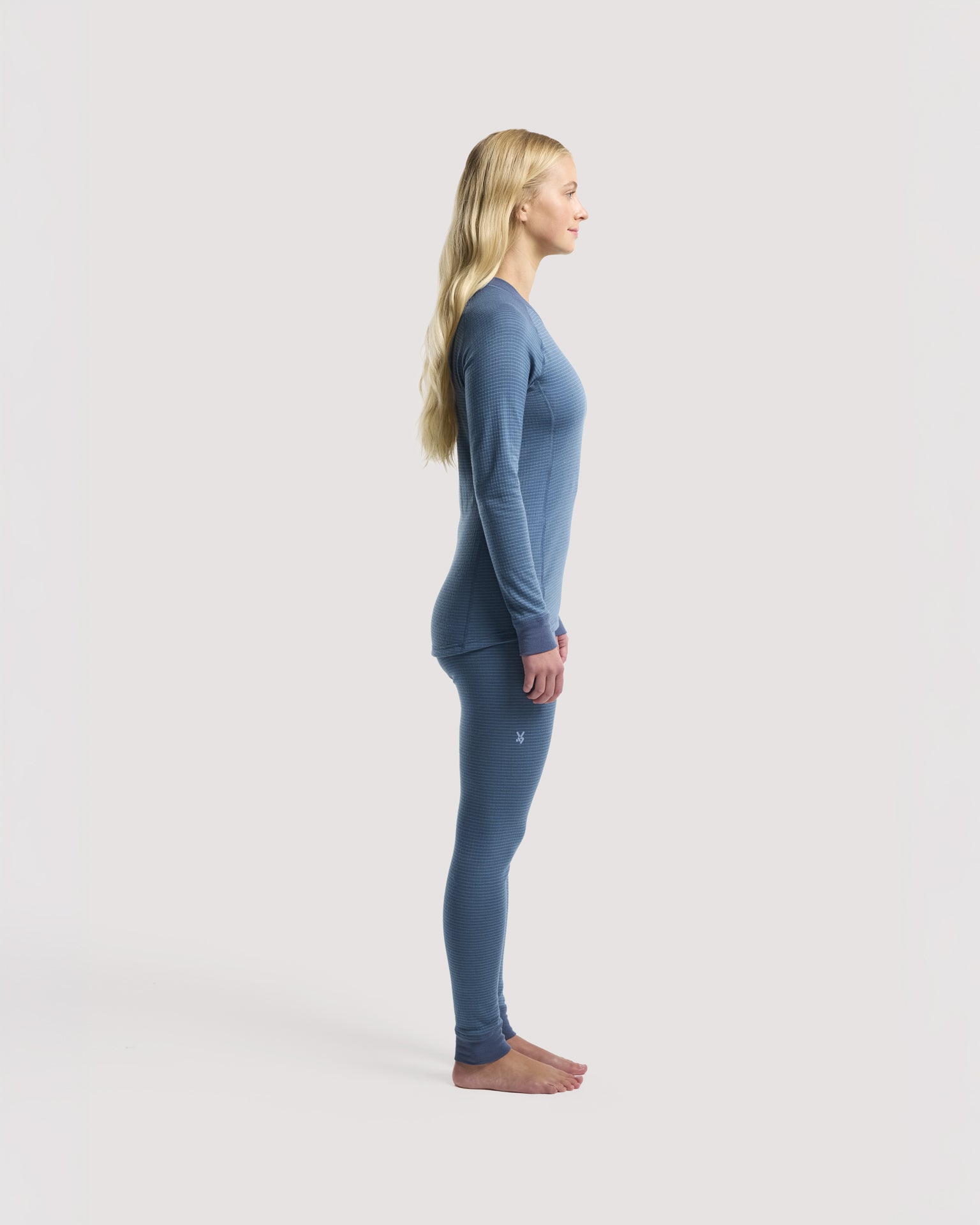Warming base layer set in Merino Wool blend, in women's fit. The channel-knit terry on the inside effectively wicks away moisture and keeps you warm and dry. The merino wool also helps regulate body temperature naturally. A perfect base layer for outdoor activities such as skiing, hiking, hunting, fishing, or for those who work outdoors in colder weather.