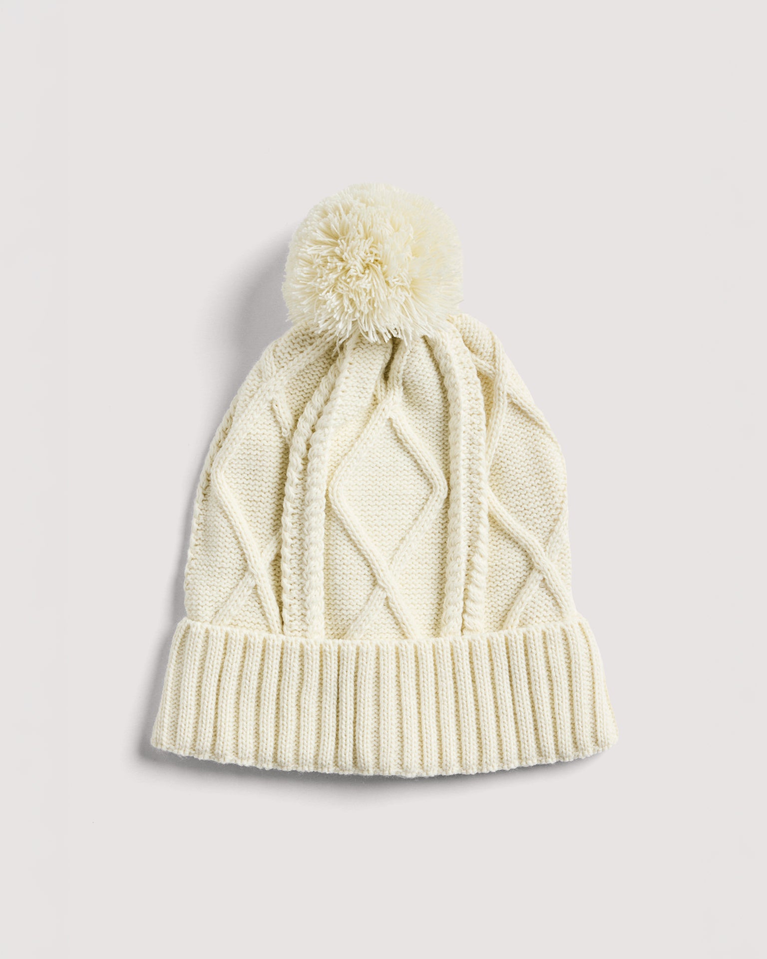 A thick and warm beanie in a Merino Wool blend with cable knit structure, fold-up cuff, and pompom. The folded cuff sits comfortably around the forehead and helps retain warmth, while the soft wool blend provides both comfort and insulation.